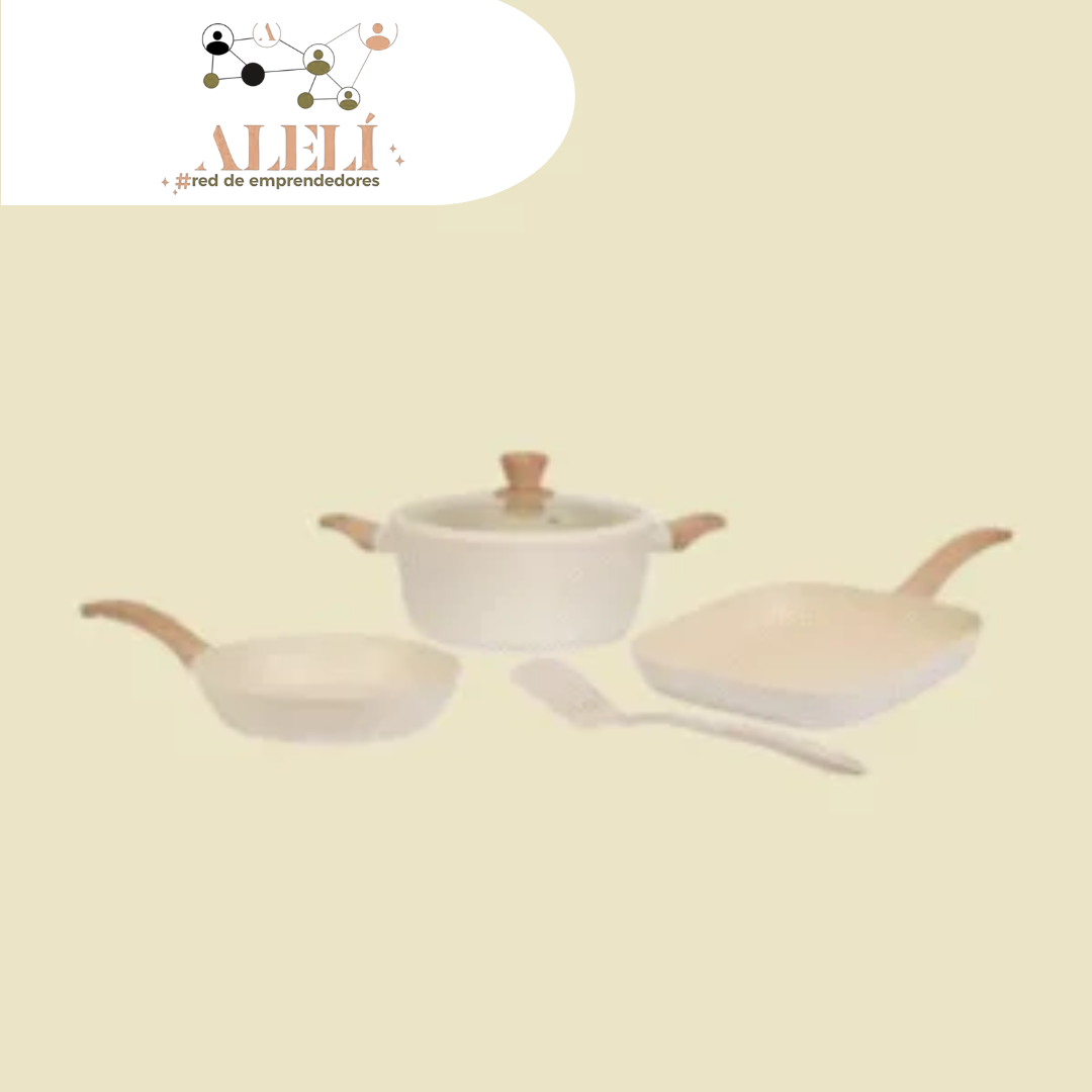 Cacerola 24 cm + sarten 24 cm + bifera acanalada 27 cm + espátula de nylon, con caja cartón.