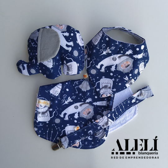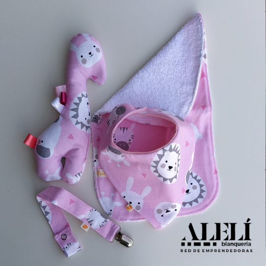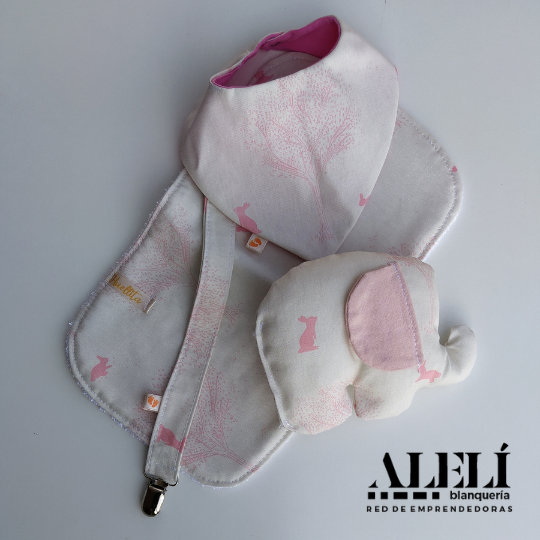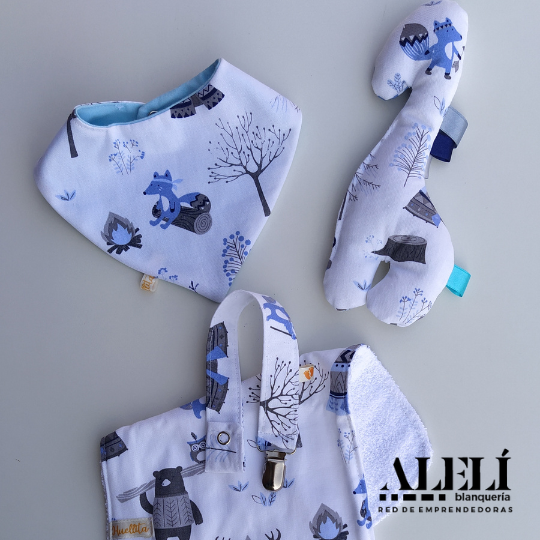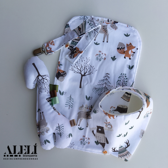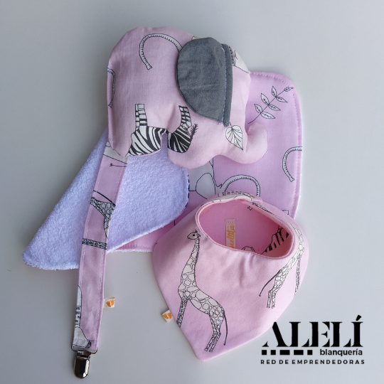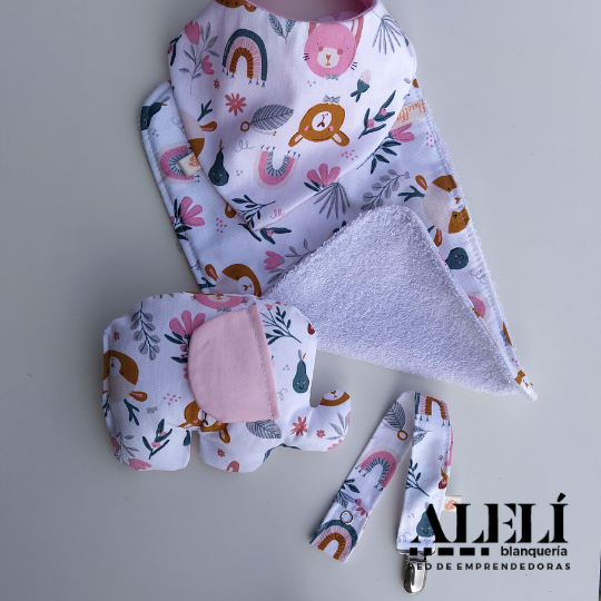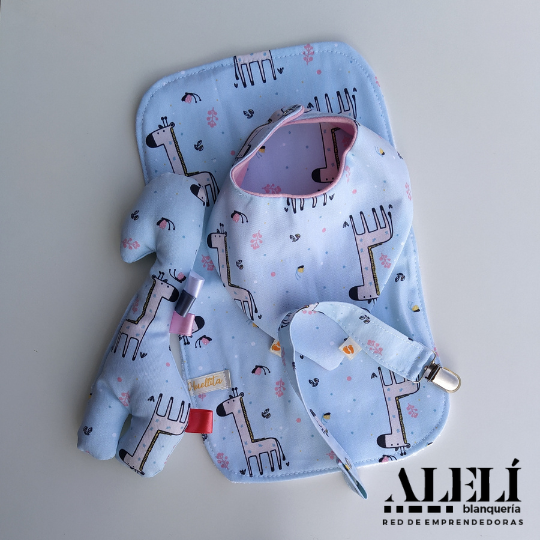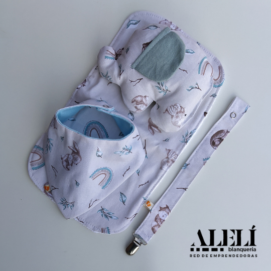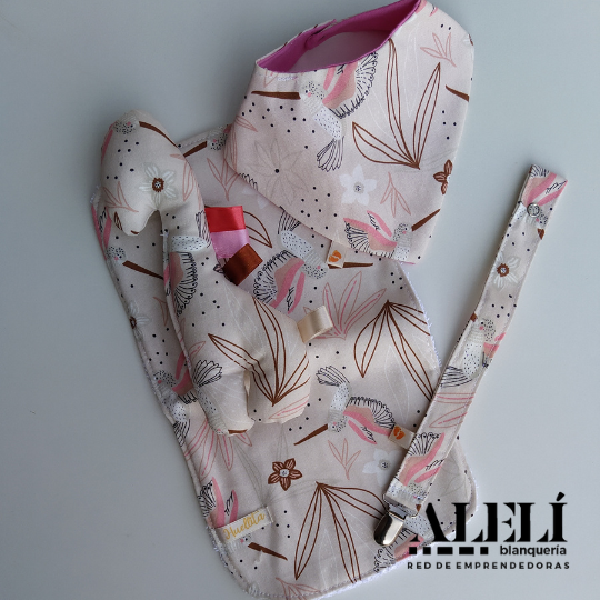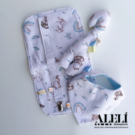 Incluye: babita, bandana, porta chupete, muñeco de apego