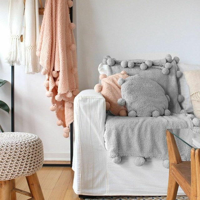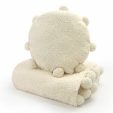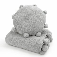 Set de corderito compuesto por una manta con pompones en los bordes y un almohadón decorativo rodeado de pompones.
