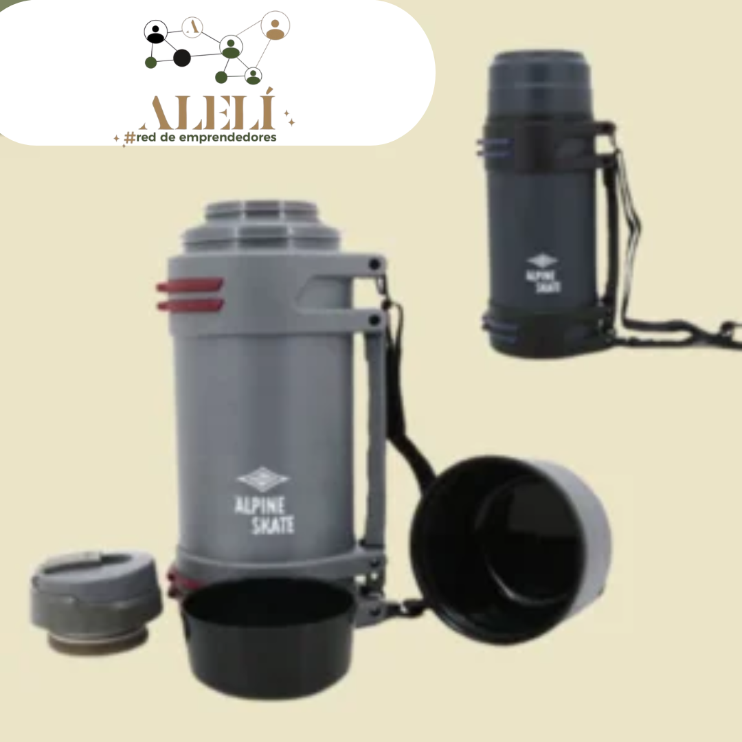 Termo Alpine Skate , de capacidad 1600 ml. Con capa Interna 100% de Acero Inoxidable AISI 304 y capa externa de acero inoxidable AISI 201. Agarradera de plastico color negro. Tapon a rosca 100% de polipropileno con burlete de color gris 100% de silicona. Tapon de tapa 100% polipropileno. Tapa externa e interna 100% de polipropileno. Con tira de color negro 100% de poliester.